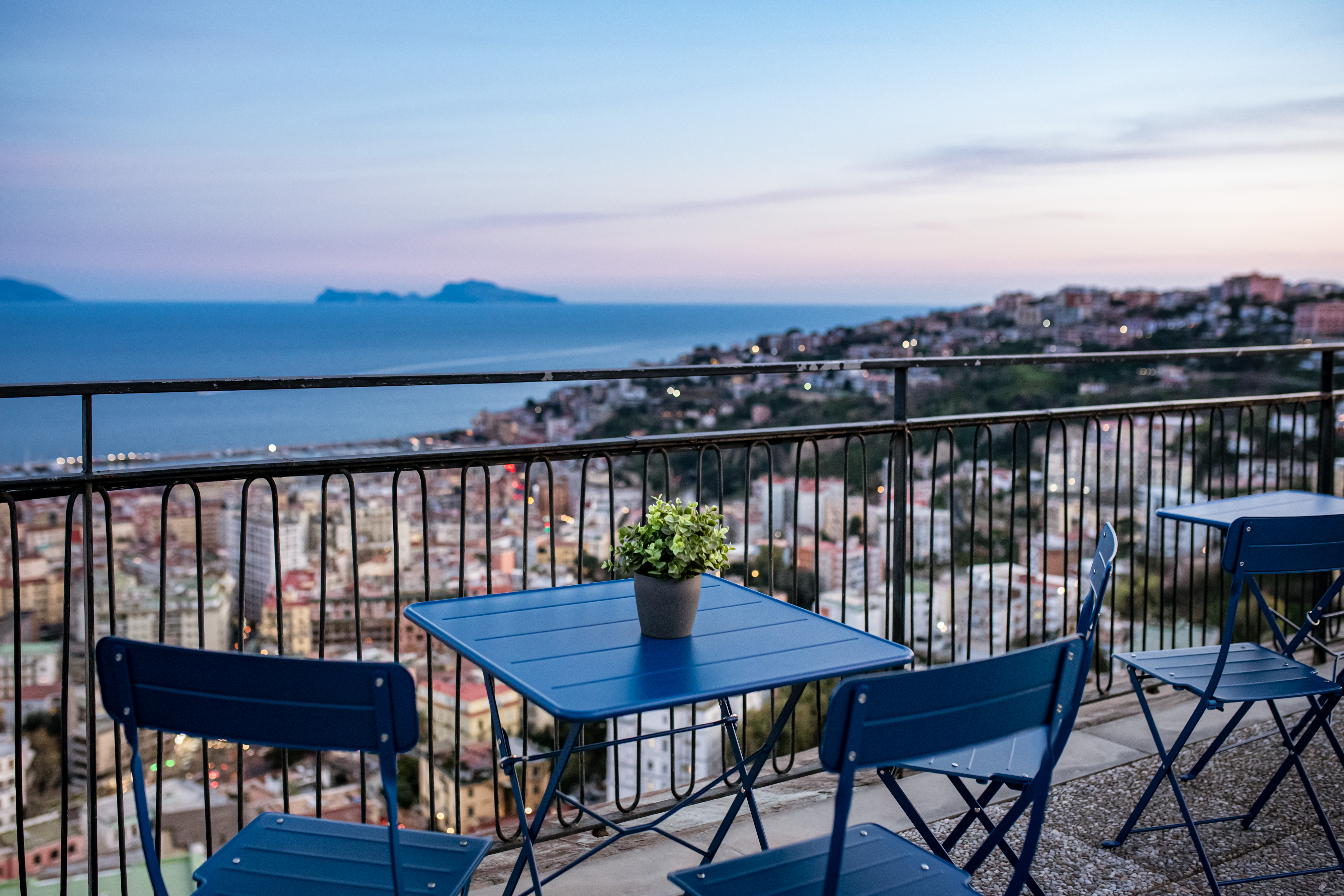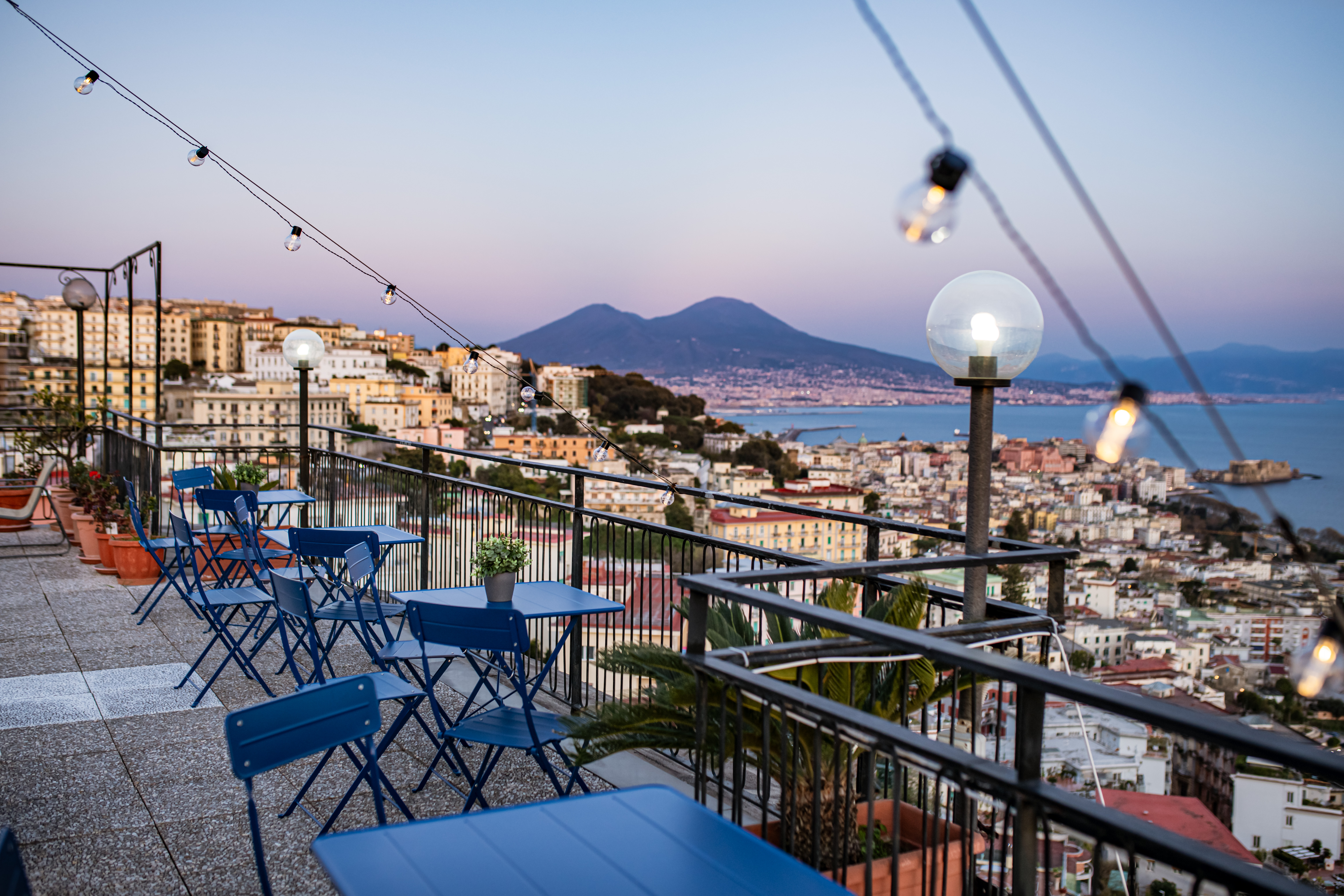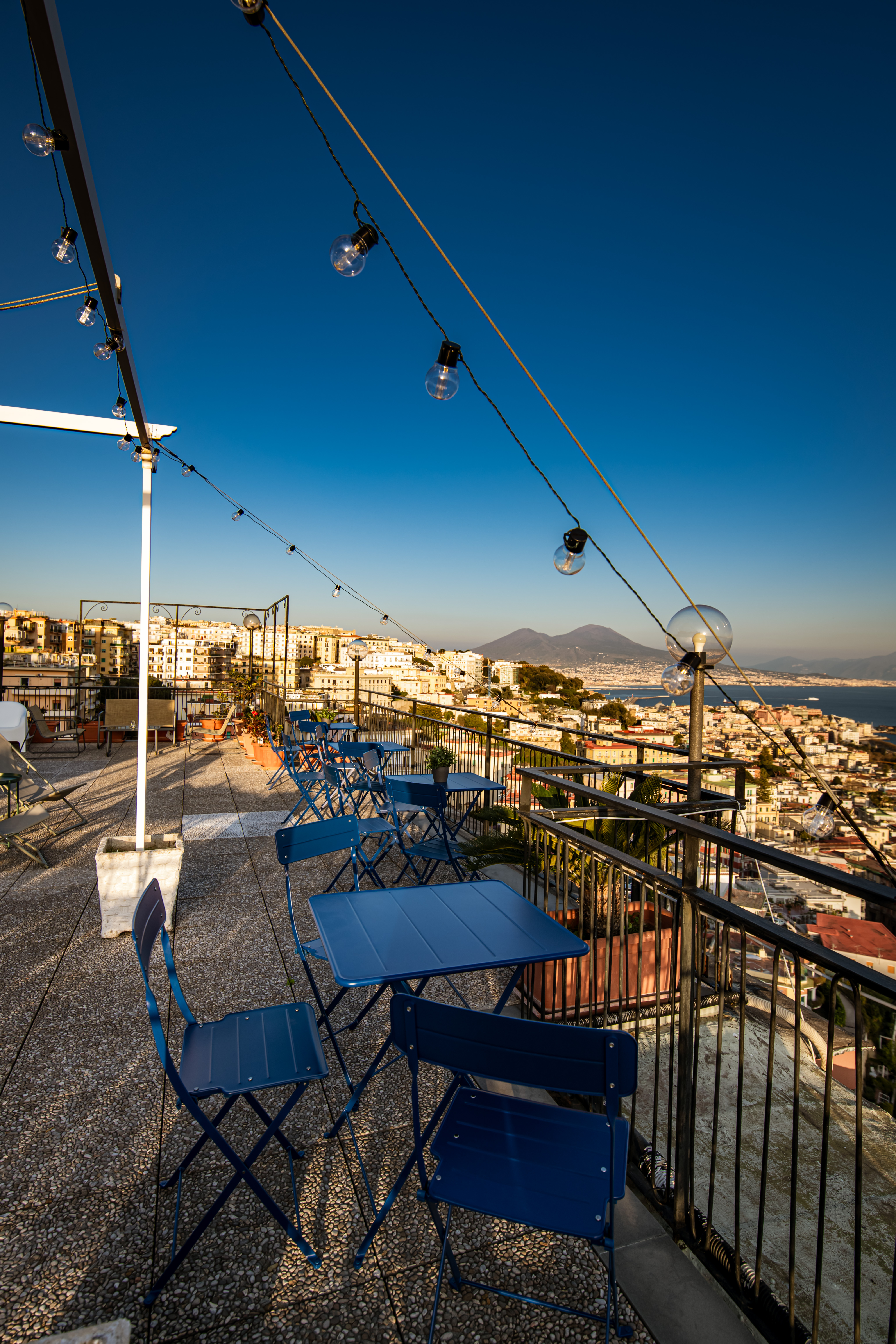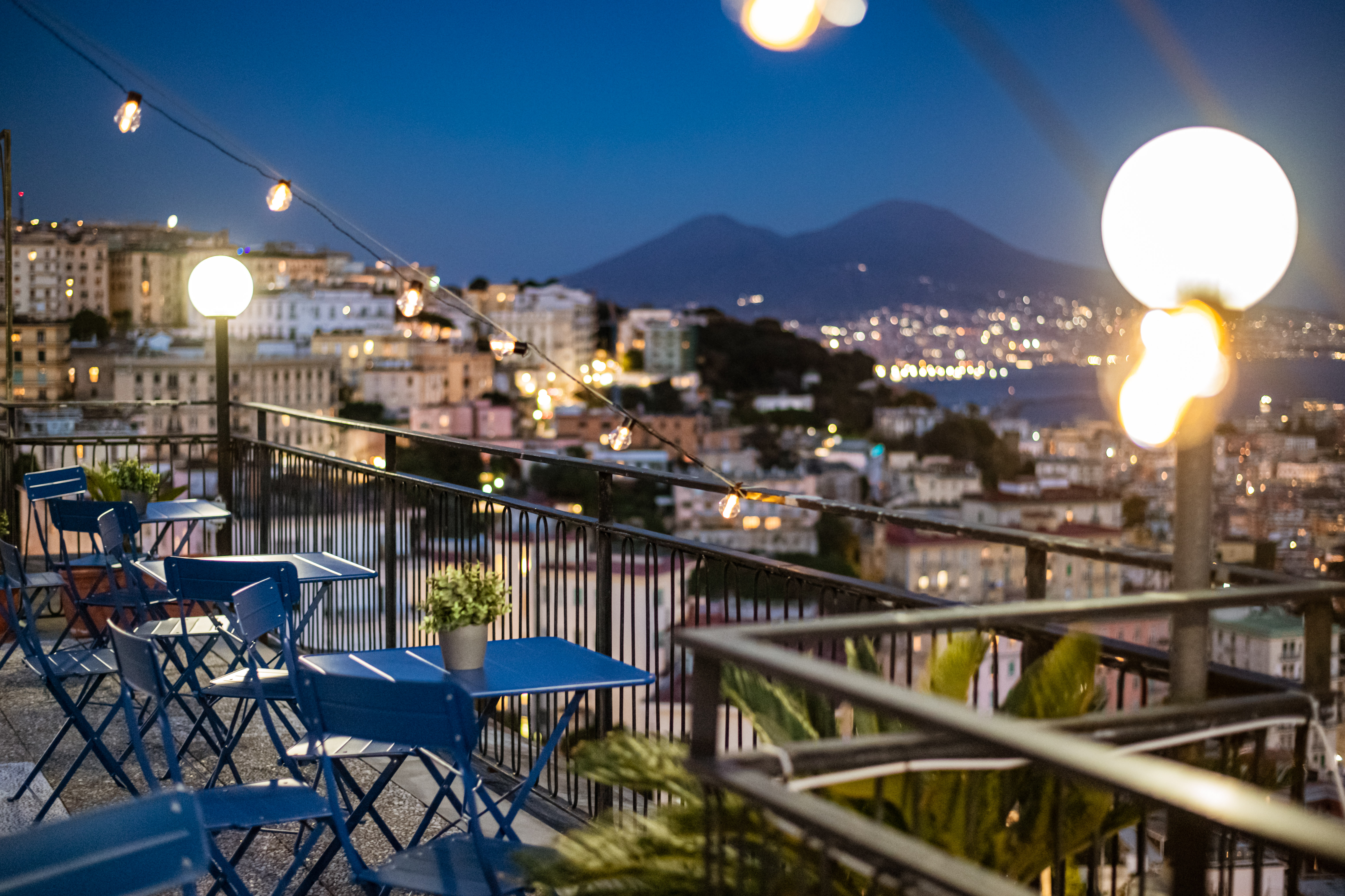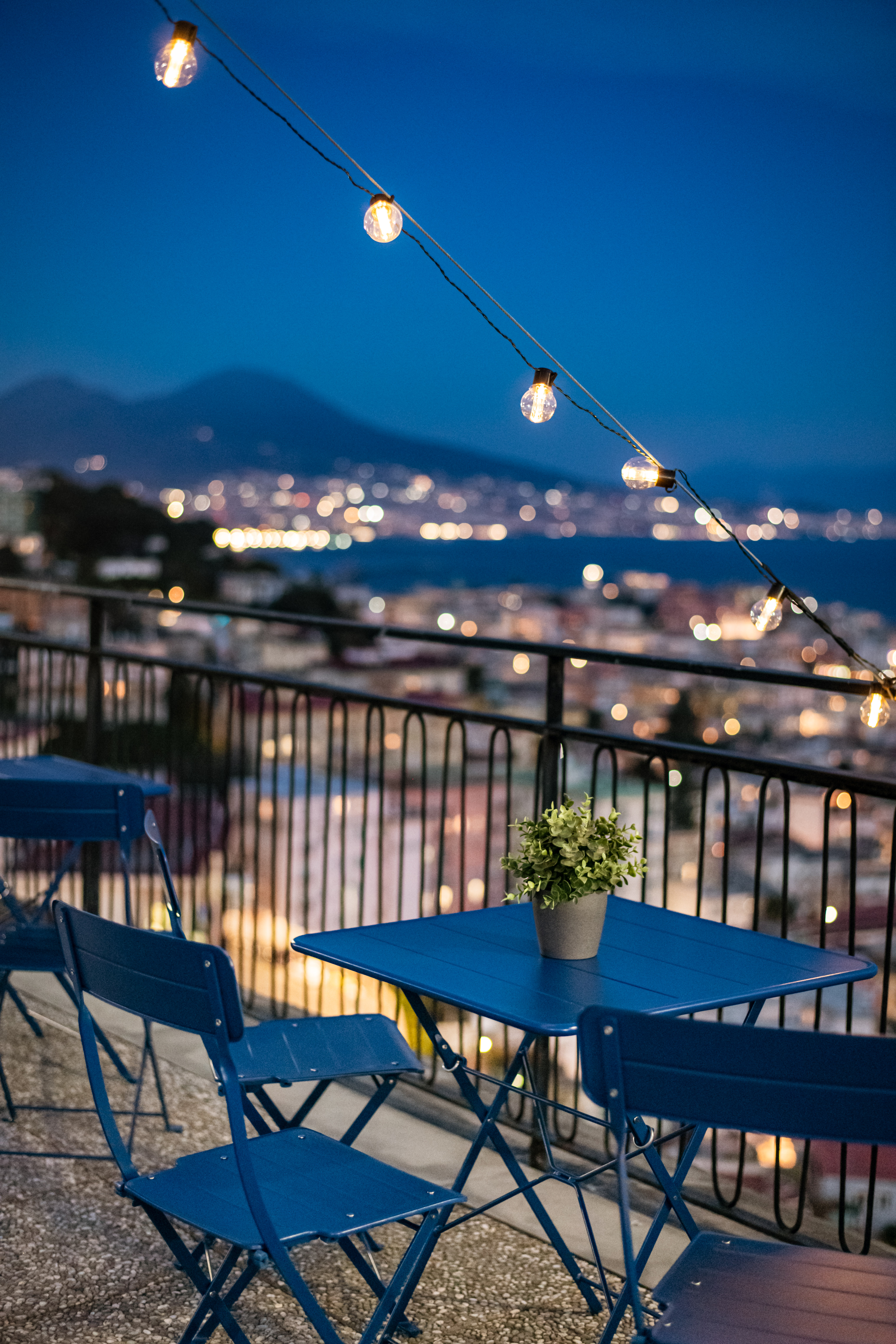 Blue Rooftop, nel cuore del Vomero, è una terrazza sospesa tra cielo e mare, con vista sul Golfo di Napoli, Capri e il Vesuvio.