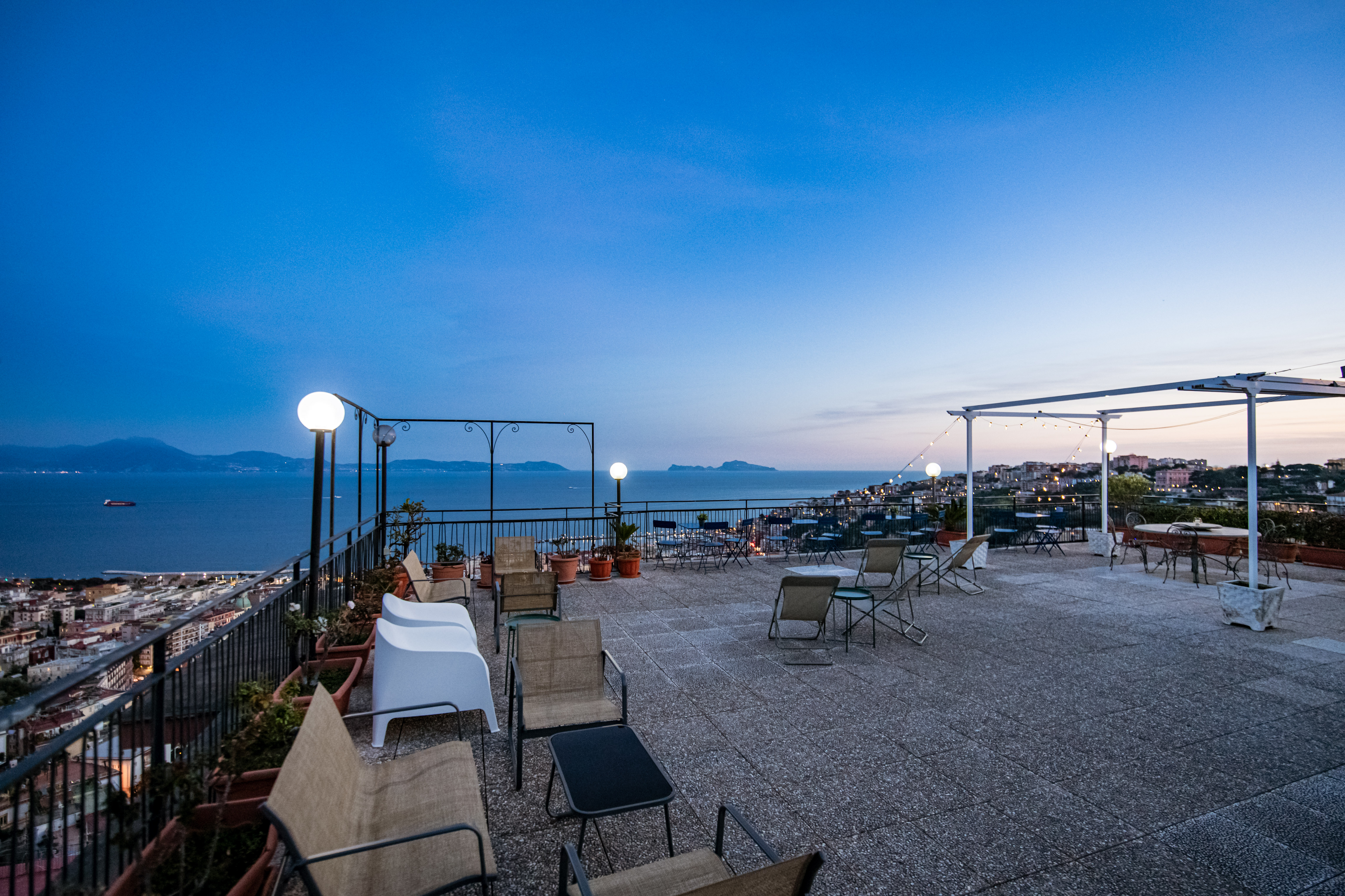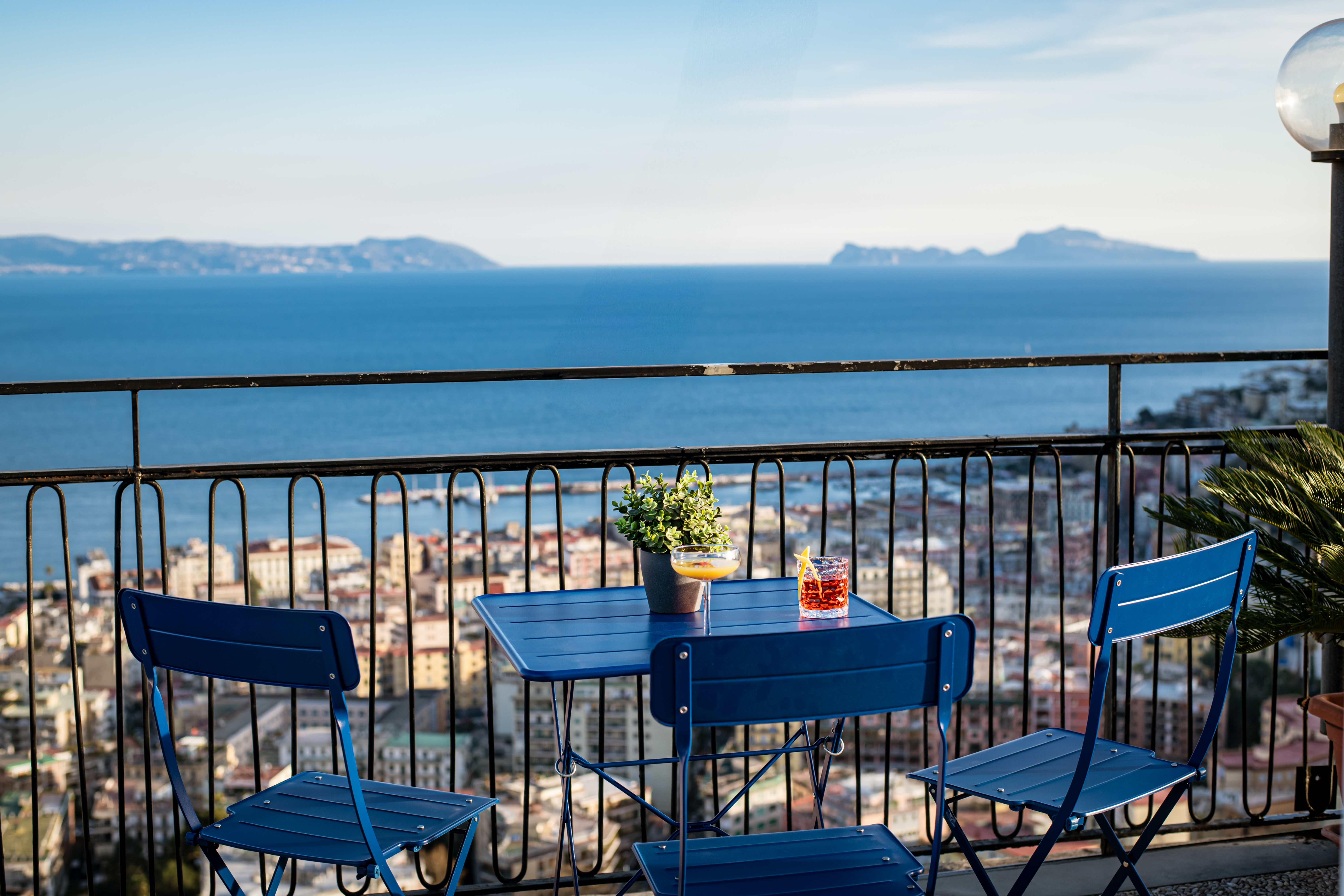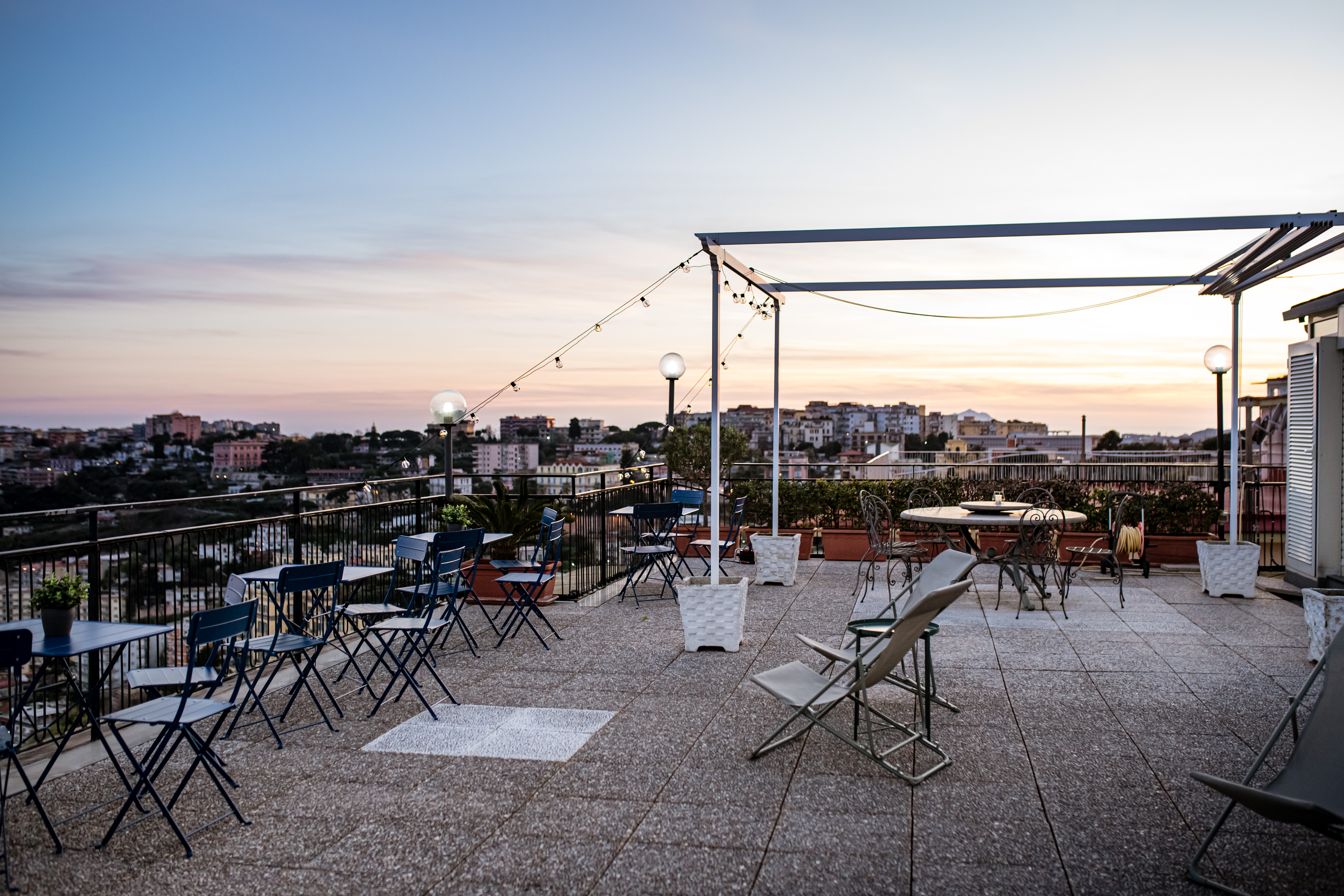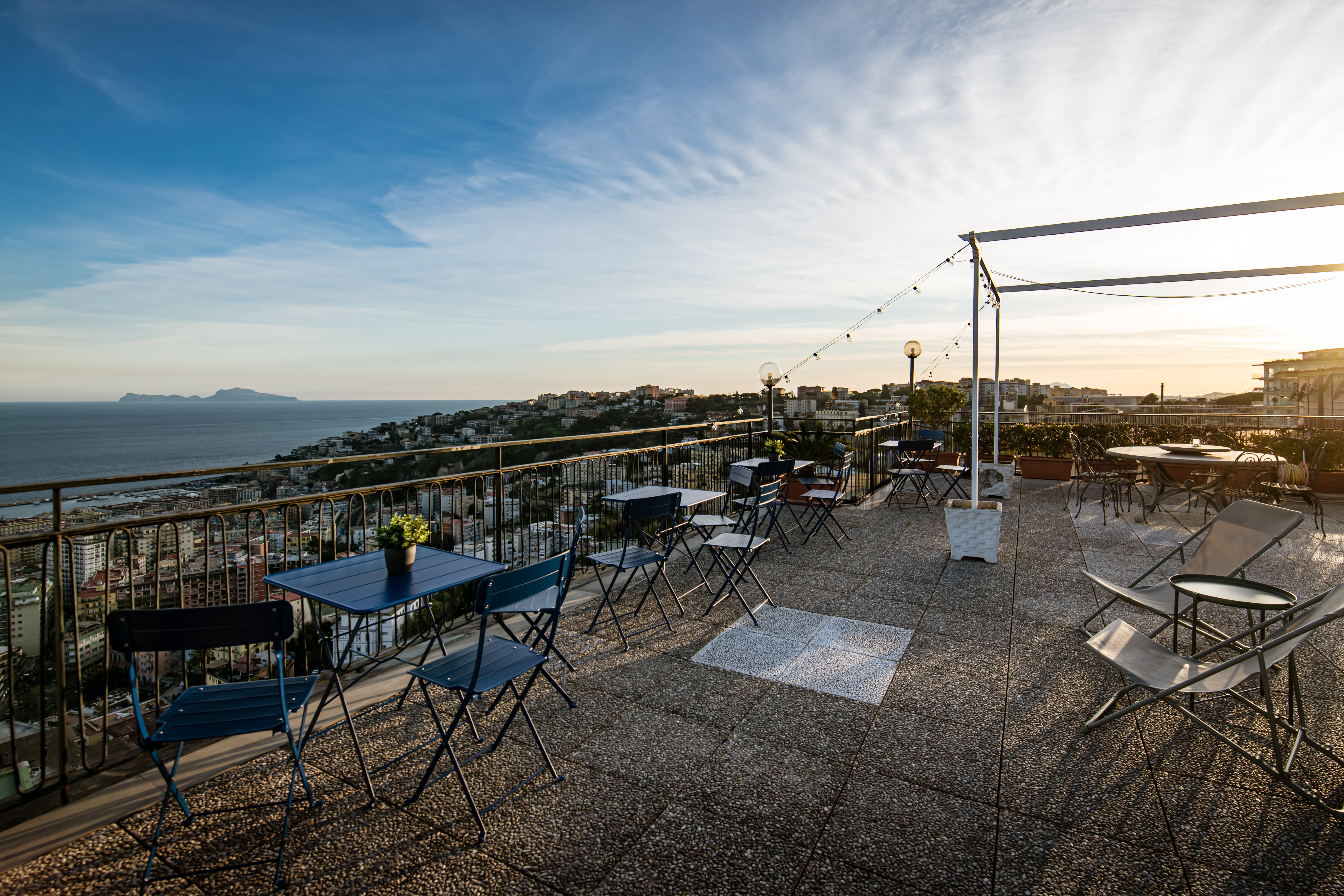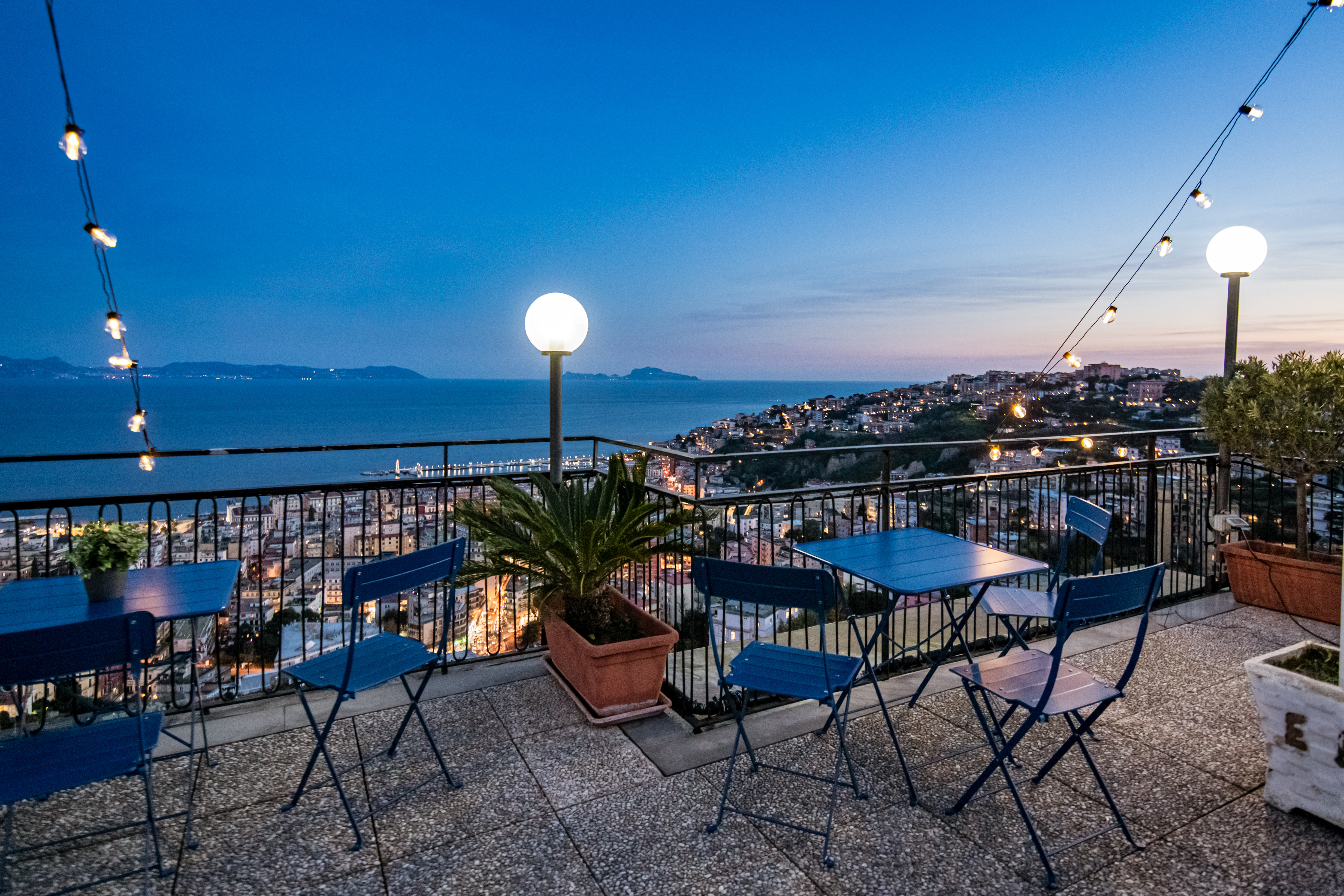 Blue Rooftop, nel cuore del Vomero, è una terrazza sospesa tra cielo e mare, con vista sul Golfo di Napoli, Capri e il Vesuvio.