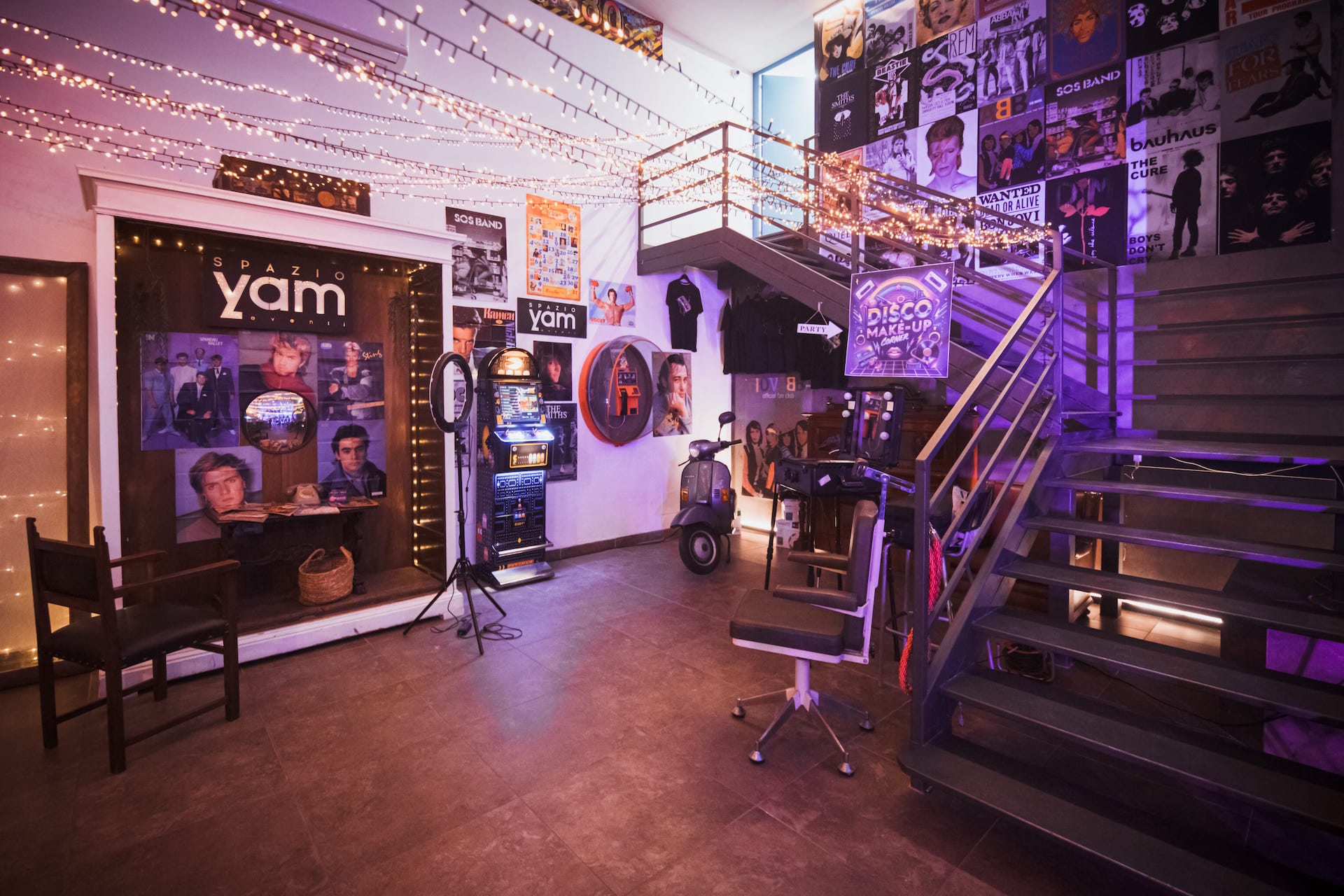 Con abbigliamento dello staff a tema, videogioco arcade, telefono a gettoni, disco ball, poster, locandine di film, angolo make-up, gadget e tanti altri dettagli.