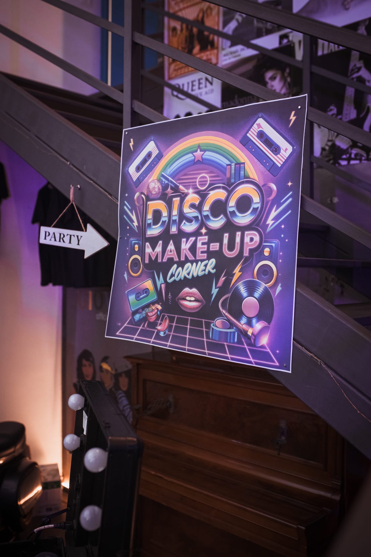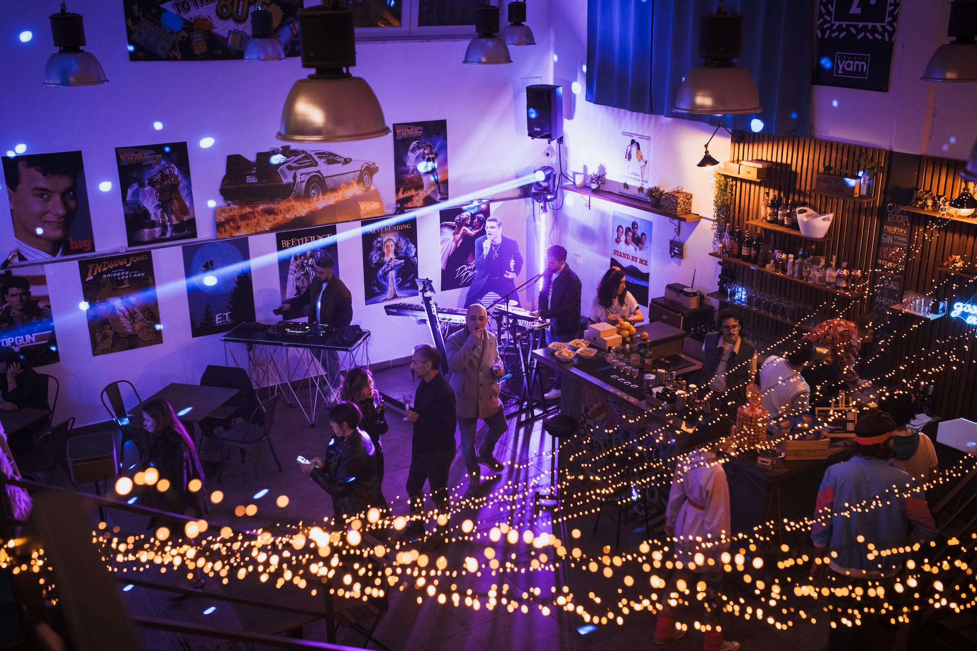 Non ci limitiamo a proporre musica anni ’80, ma ricreiamo il mood dell’epoca in ogni angolo. Lo staff indossa abiti a tema, accogliendo gli ospiti già con il giusto spirito. Inseriamo dettagli unici: cassone arcade per rivivere le sale giochi, telefono a gettoni per un tocco nostalgico, disco ball e luci fluo per la pista da ballo, poster e locandine dei film cult che hanno segnato la decade. E ancora: l’angolo make-up con glitter e colori sgargianti, caramelle iconiche come le Goleador e le Big Babol, gadget vintage e photo-corner dedicati.